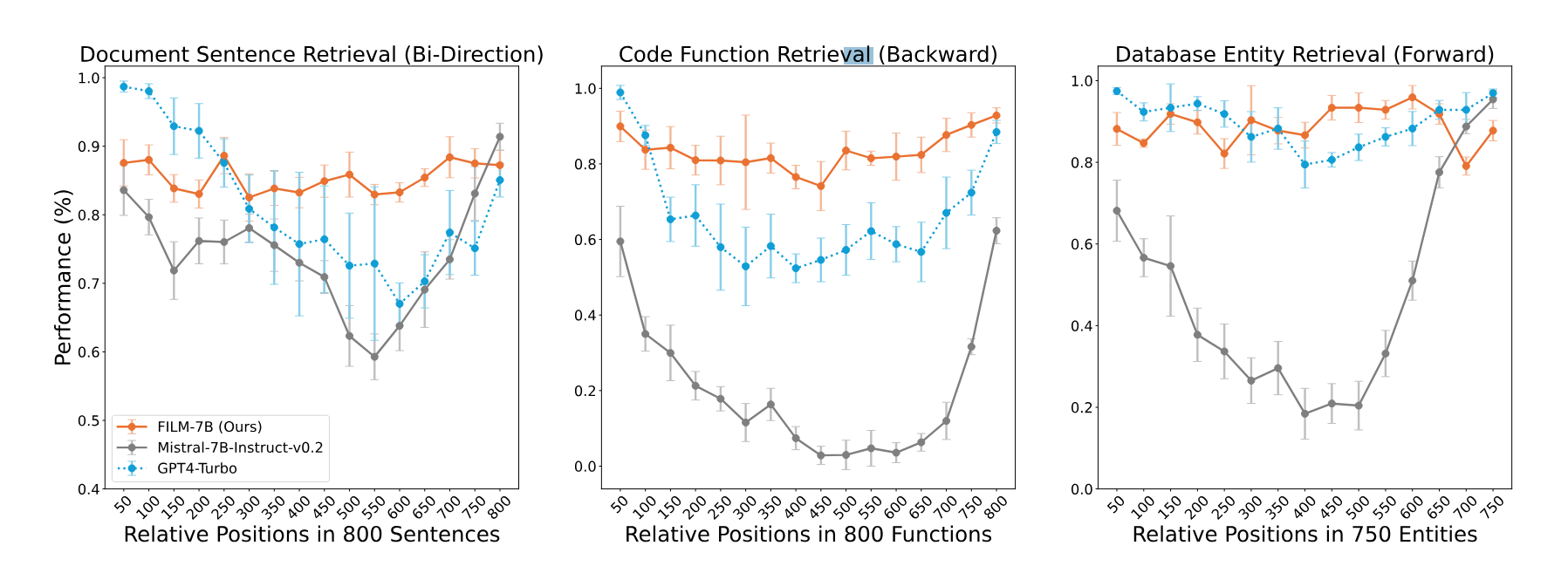Die Forschenden wendeten IN2 auf Mistral-7B an. Das daraus resultierende FILM-7B (FILl-in-the-Middle) wurde an drei neuen, speziell für lange Kontexte konzipierten Extraktionsaufgaben getestet, die verschiedene Kontexttypen (Dokument, Code, strukturierte Daten) und Suchmuster (vorwärts, rückwärts, bidirektional) abdecken.