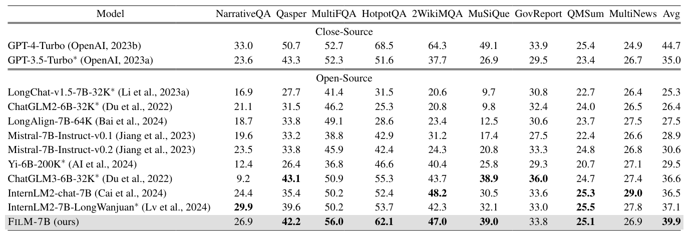Darüber hinaus verbessert sich FILM-7B auch signifikant bei realen Aufgaben mit langem Kontext, wie Zusammenfassungen langer Texte. Das Training mit synthetischen Daten scheint also gut auf reale Szenarien übertragbar zu sein. Gleichzeitig bleiben die Fähigkeiten von FILM-7B bei Aufgaben mit kurzem Kontext auf dem Niveau des ursprünglichen Modells.