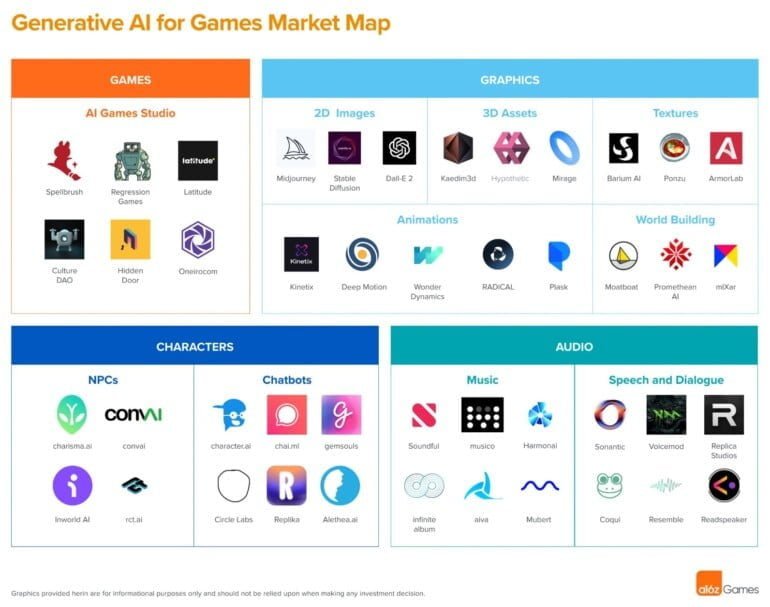 Die folgende Grafik von a16z zeigt eine Übersicht über kommerzielle Projekte und Start-ups, die sich mit generativer KI befassen, die für Gaming-Studios interessant sein könnte. Trotz aller Begeisterung stehe generative KI für Gaming ganz am Anfang, schreibt a16z. Neben großen grundlegenden Modellen wie Stable Diffusion könnten spezifisch für die Industrie entwickelte KI-Tools einen Mehrwert bringen.