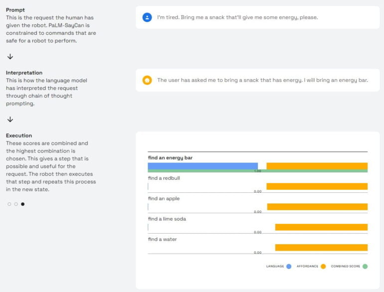 Für die Kombination aus Sprach-KI und Alltagsroboter setzt Googles Forschungsteam speziell auf PaLMs Fähigkeit zu Gedankenketten ("Chain of thought prompting"). Dabei interpretiert das Modell eine Anweisung, generiert mögliche Schritte für die Erfüllung der Anweisung und bewertet deren Wahrscheinlichkeit für die Erfüllung der Gesamtaufgabe. Die Aktion, die vom Sprachmodell am höchsten bewertet wird, führt der Roboter aus.