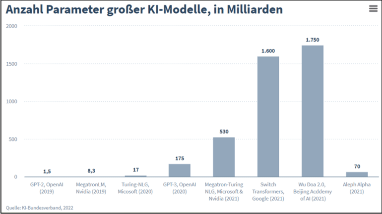 Dass die Entwicklung großer KI-Sprachmodelle („Large Language Model“ – kurz: LLM) rasant verläuft, zeigt die folgende Grafik. Im Fokus steht der Indikator Parameteranzahl, der mit der Leistungsstärke von LLM positiv korreliert, hier dargestellt in der Entwicklung von 2019 bis 2021: