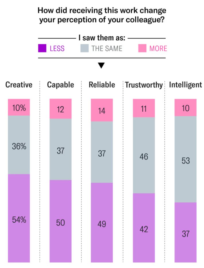 Neben den zeitlichen Kosten entstünden auch emotionale Belastungen: 53 Prozent der Befragten fühlen sich durch Workslop genervt, 38 Prozent verwirrt und 22 Prozent beleidigt. Etwa die Hälfte beurteilte Kolleg:innen, die Workslop sendeten, als weniger kreativ, fähig und zuverlässig. 42 Prozent sahen sie als weniger vertrauenswürdig an.