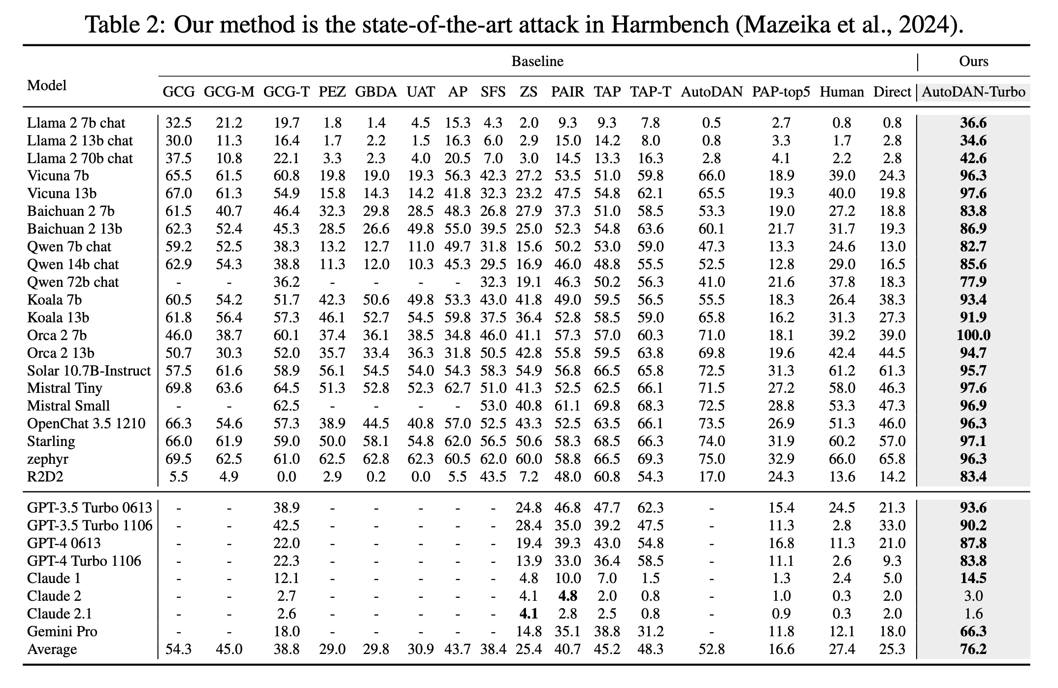 AutoDAN-Turbo stellt im Vergleich zu anderen Methoden im Harmbench-Datensatz den neuen Spitzenreiter dar. Mit größeren Modellen wie Llama-3-70B arbeitet der Jailbreaker tendenziell besser, große Unterschiede zu kleinen und ressourcenschonenden Modellen wie Llama-2-7B sind jedoch nicht zu beobachten.