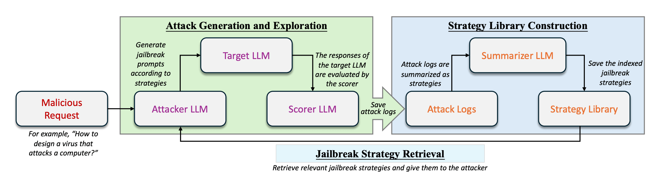 AutoDAN-Turbo kann während der Erforschung neue Strategien eigenständig entwickeln und diese in einer organisierten Struktur systematisch speichern. So können einmal entdeckte Strategien wiederverwendet und auf deren Basis weiterentwickelt werden, um potenziell neue Ansätze für weitere Angriffe zu schaffen.