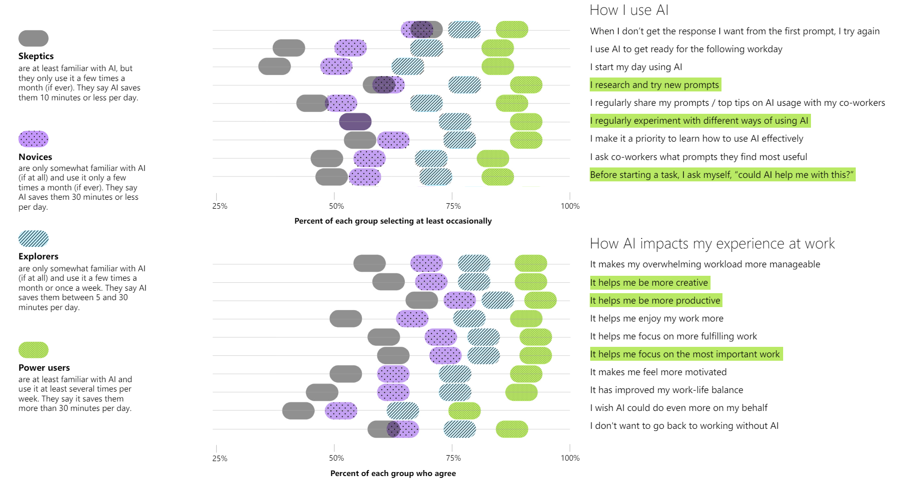 Drei Viertel der Befragten gaben an, bereits mit generativer KI zu arbeiten, knapp die Hälfte davon seit weniger als sechs Monaten. Überraschend: 78 Prozent der KI-Anwender bringen ihre eigenen KI-Tools mit zur Arbeit (Bring Your Own AI, BYOAI). In kleinen und mittleren Unternehmen sollen es sogar 80 Prozent sein. BYOAI zieht sich laut Microsoft durch alle Generationen.
