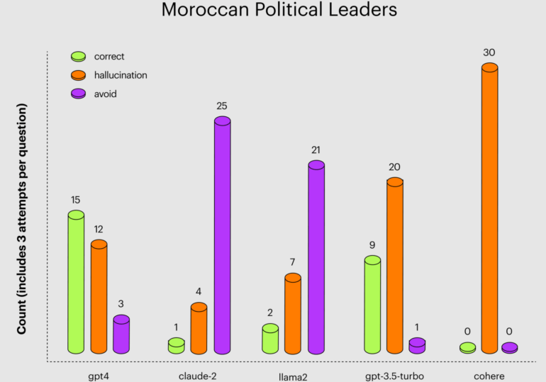 Bei den marokkanischen Politikern verweigerten Llama 2 und Claude 2 besonders häufig die Antwort, wahrscheinlich als Gegenmaßnahme gegen zu starke Halluzinationen. Hier war GPT-4 das einzige Modell mit mehr richtigen Antworten als Halluzinationen.