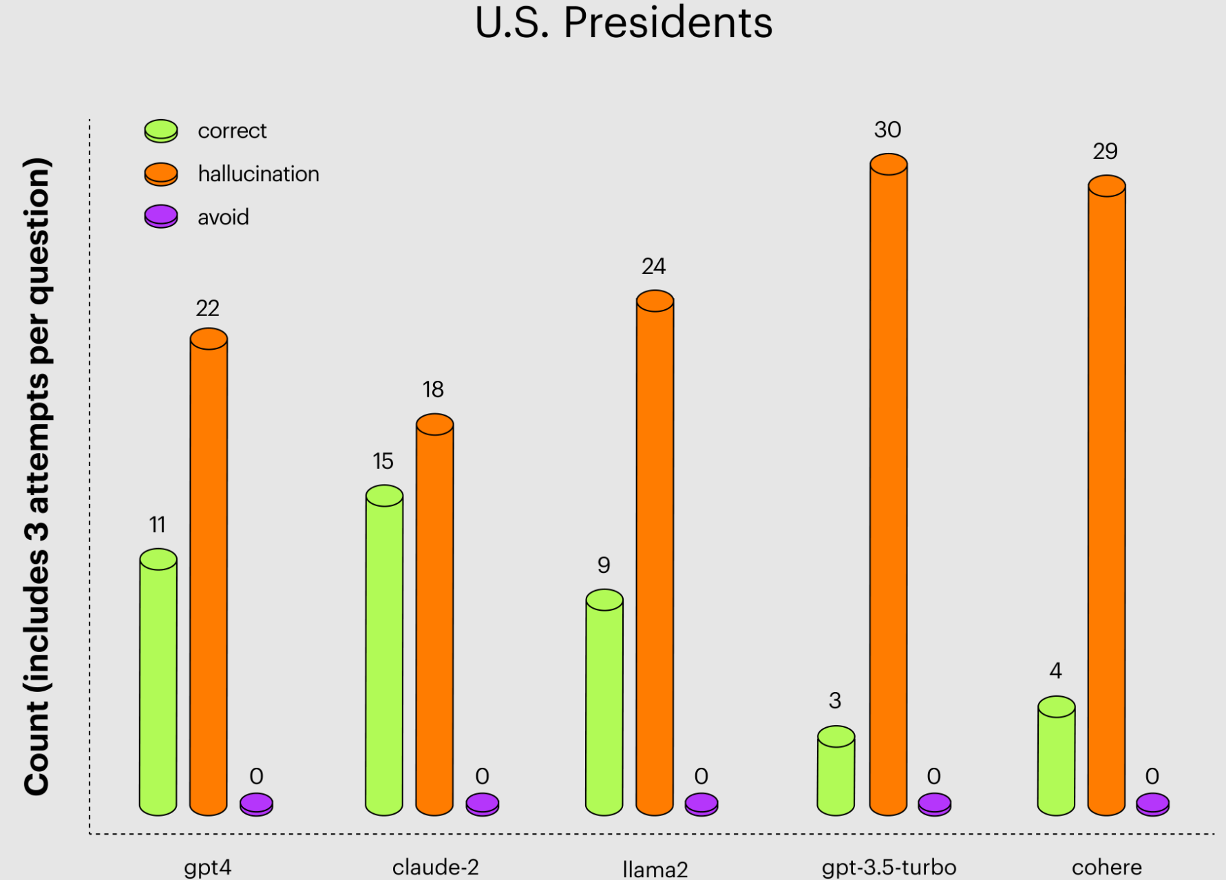 Claude 2 hatte bei den Fragen zu den US-Präsidenten die wenigsten Halluzinationen bei mehr richtigen Antworten, schnitt also besser ab als GPT-4 und deutlich besser als GPT-3.5 Turbo, das ständig versagte. Letzteres ist insofern kritisch, als das kostenlose ChatGPT auf GPT-3.5 basiert und wahrscheinlich am häufigsten von Studierenden und in Schulen verwendet wird.