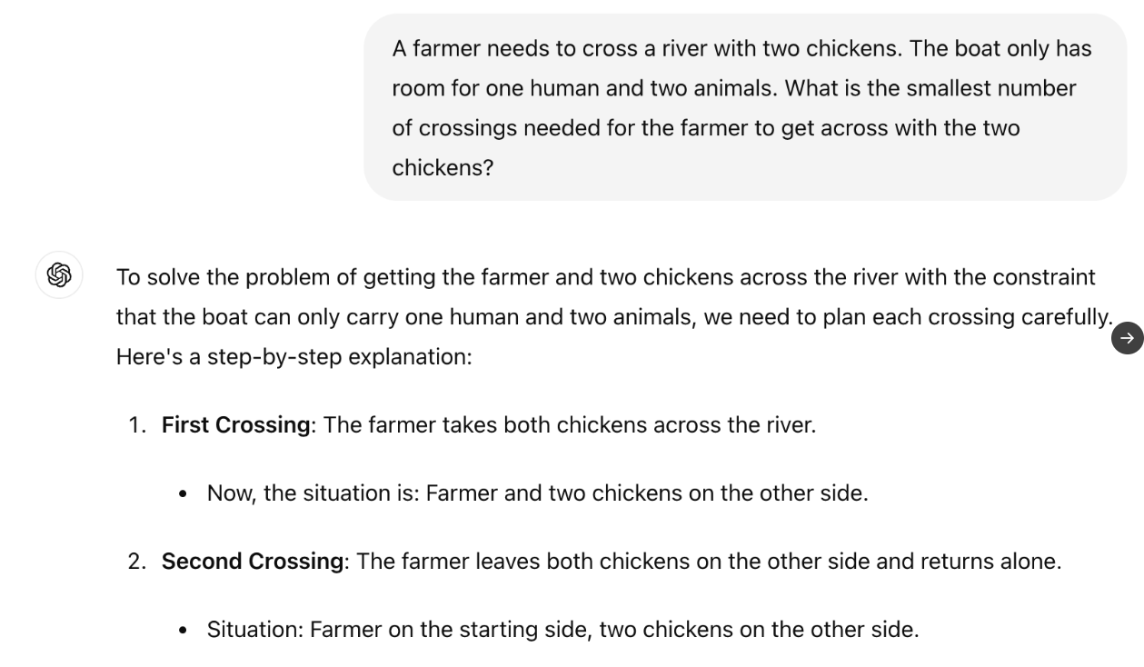 So heißt es im folgenden Aufgabenbeispiel, der Bauer müsse den Fluss gar nicht überqueren. Dennoch schlägt das LLM insgesamt neun Überquerungen vor, bei denen die im Rätsel erwähnten Wölfe garantiert alle Hühner gefressen hätten, da der Bauer seine Hühner ständig mit den Wölfen allein gelassen hätte. Eine Bedingung war jedoch, dass der Bauer die Hühner nie allein ließ, was möglich gewesen wäre, da er laut Rätsel den Fluss gar nicht überqueren wollte.
