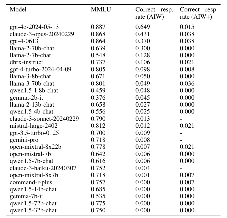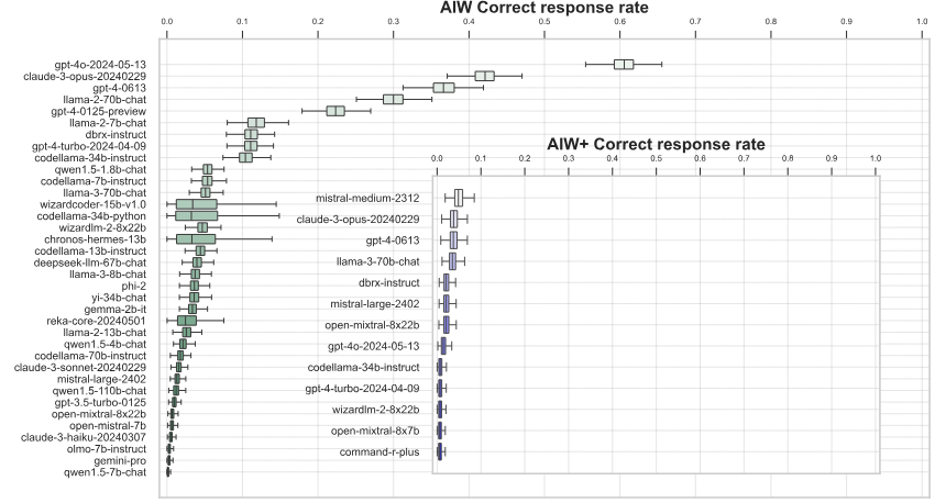 Eine härtere Version der Aufgabe (AIW+), die eine zusätzliche Hierarchie einführte, brachte selbst die besten Modelle GPT-4 und Claude an den Rand des völligen Zusammenbruchs ihrer Denkfähigkeit. Nur Mistral Medium, GPT-4 und Claude 3 Opus konnten in seltenen Fällen eine richtige Lösung liefern.