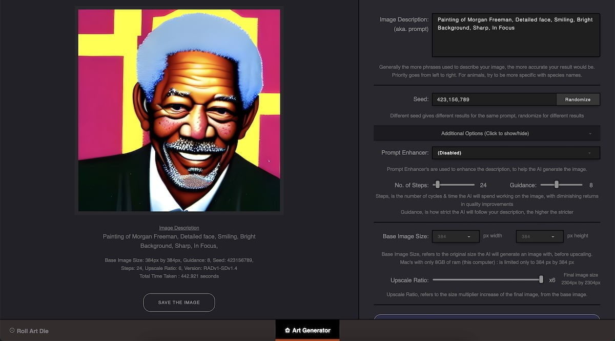 Roll Art Die ist im Gegensatz zu den beiden vorher genannten Lösungen einfach über den App Store installierbar. Der Download ist mit rund zwölf Gigabyte aber deutlich größer als die vier Gigabyte, die DiffusionBee und CHARL-E einnehmen. Bildgenerationen lassen sich per Seed, Steps, Guidance und Auflösung anpassen.