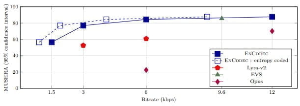 Bei der menschlichen Bewertung der Audioqualität verschiedener Komprimierungsmethoden, darunter Googles Lyra-v2, schnitt Encodec am besten ab, hier insbesondere die Transformer-basierte Variante.