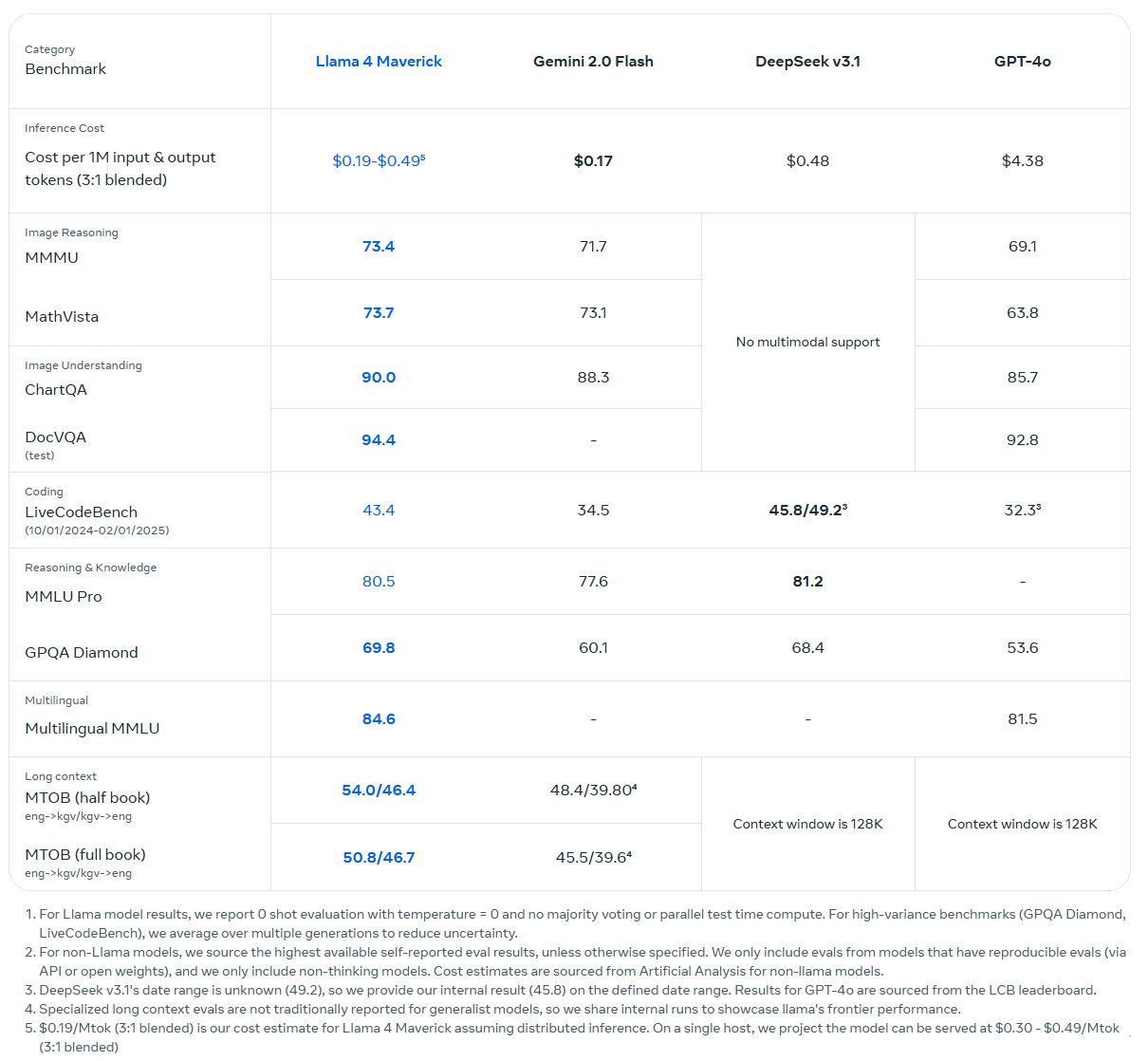 Laut Meta schlägt es OpenAIs GPT-4o und Googles Gemini 2.0 Flash in verschiedenen Benchmarks und erreicht ähnliche Ergebnisse wie DeepSeek v3 bei Reasoning und Coding - mit weniger als der Hälfte der aktiven Parameter. In der experimentellen Chatversion erreicht Maverick 1417 Punkte in der LMArena ELO Rangliste.