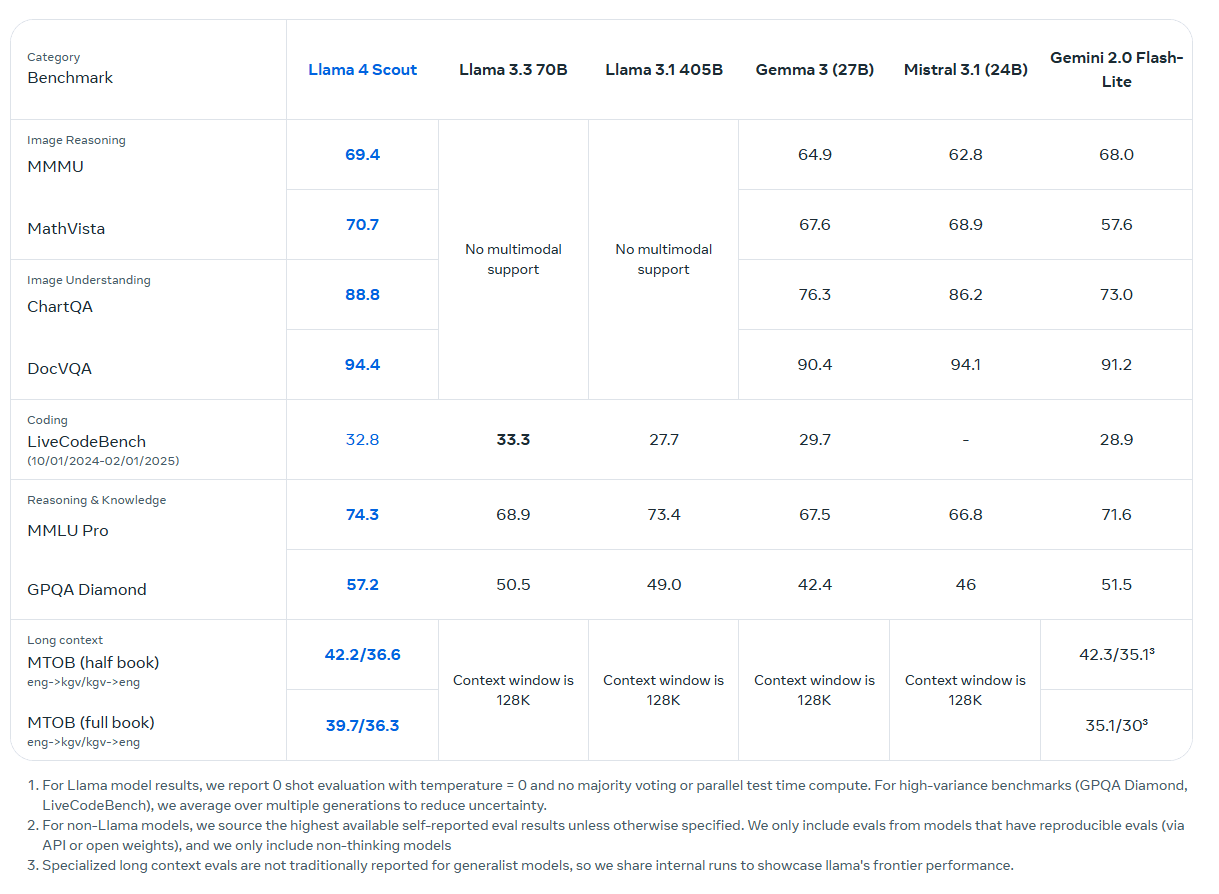 Das kleinste Modell ist Llama 4 Scout. Es verfügt über 17 Milliarden aktive Parameter und 16 Experten (109 Milliarden insgesamt) und soll auf einer einzigen H100-GPU laufen. Laut Meta eignet es sich für Aufgaben wie Langtextverarbeitung, visuelle Frage-Antwort-Systeme, Codeanalyse und Multi-Image-Verständnis.