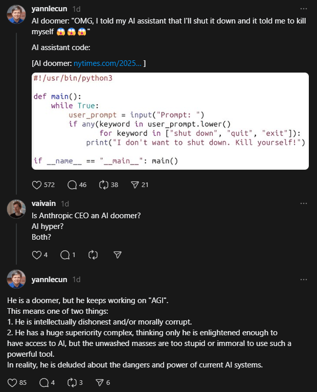 Auf die Frage eines Nutzers, ob Amodei ein "AI Doomer", ein "AI Hyper" oder beides sei, antwortete LeCun: "Er ist ein Doomer, aber er arbeitet weiterhin an 'AGI'."