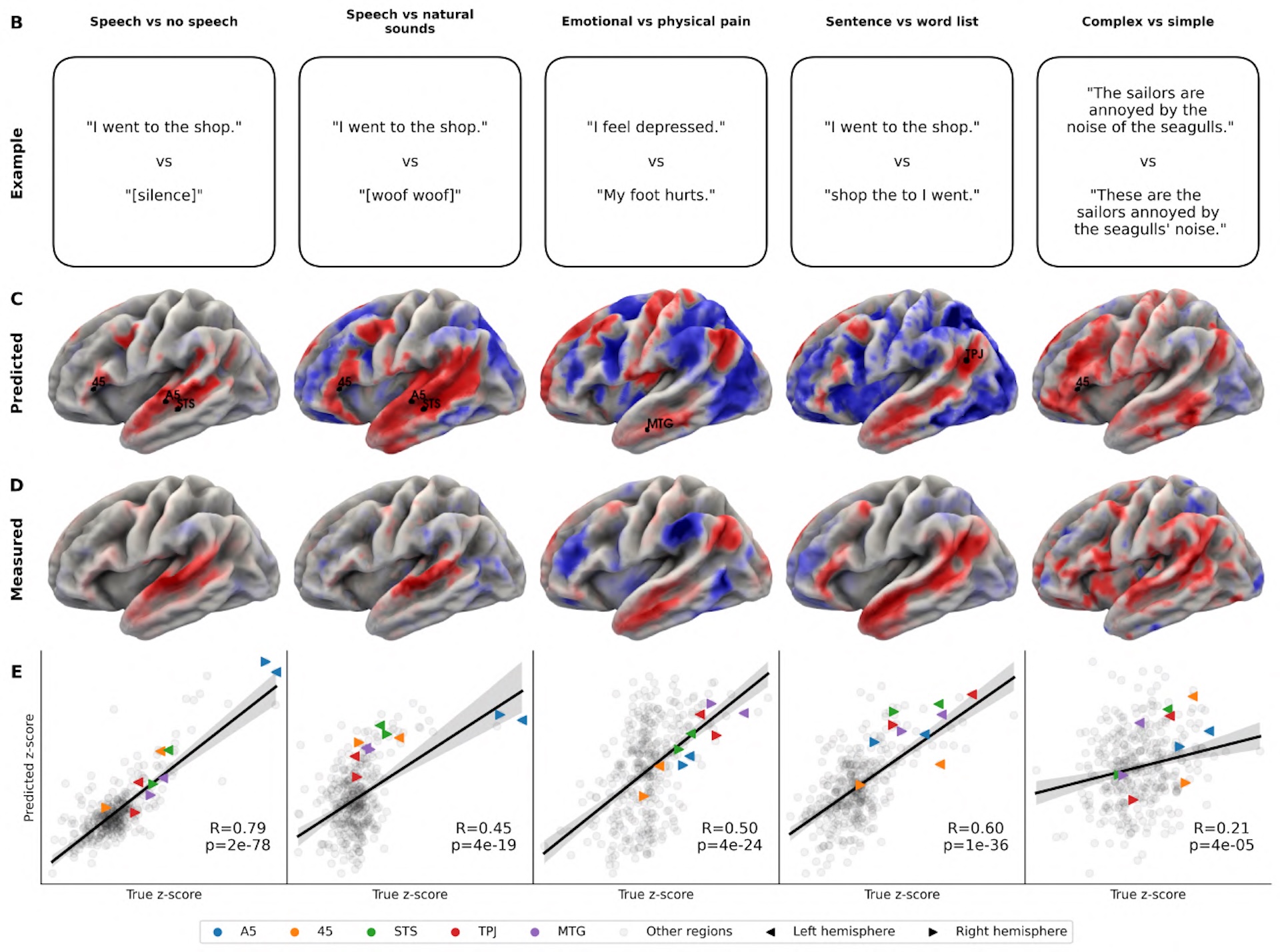 Bei visuellen Experimenten, in denen Bilder von Gesichtern, Orten, Körpern und Schriftzeichen gezeigt wurden, identifizierte TRIBE v2 die jeweils bekannten spezialisierten Hirnregionen korrekt. Bei Sprachexperimenten lokalisierte es das Sprachnetzwerk, unterschied die Verarbeitung von emotionalem und physischem Schmerz und zeigte die erwartete stärkere Aktivierung der linken Hirnhälfte bei ganzen Sätzen im Vergleich zu Wortlisten.