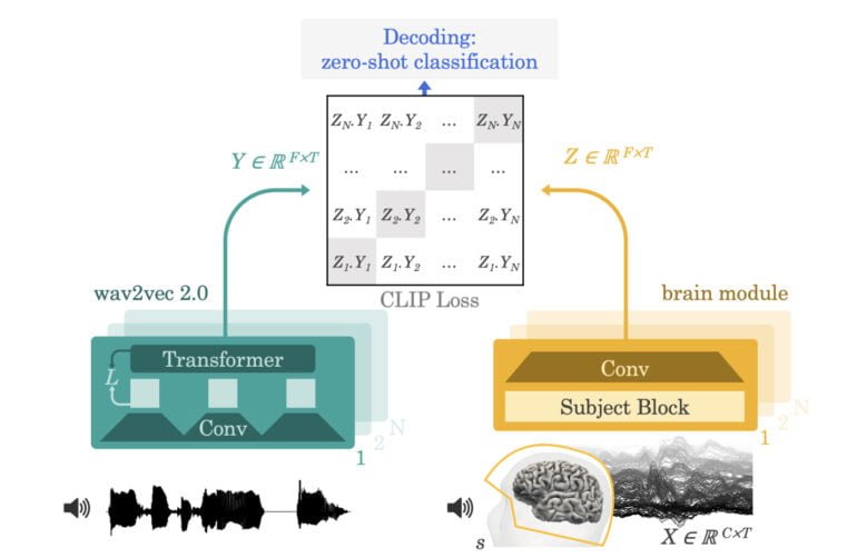 In der nun veröffentlichten Arbeit baut das Team um King auf die Arbeiten vom Juni auf: Das dort mit 600 Stunden Sprachaufnahmen trainierte Wav2Vec-Modell extrahiert eine Repräsentation einer drei Sekunden kurzen Sprachaufnahme und lernt, diese Repräsentationen entsprechenden Repräsentationen von Gehirnaktivitäten aus MEG und EEG zuzuordnen.