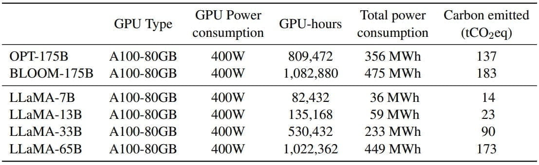 Der Trainingsaufwand und damit der CO₂-Verbrauch des LLaMA-Modells soll auf dem Niveau von 175-Milliarden-Modellen wie OPT und Bloom liegen. Der spätere Betrieb ist jedoch günstiger (siehe unten).
