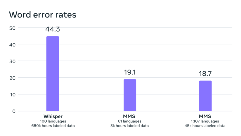 Da 32 Stunden pro Sprache nicht genug Trainingsmaterial für ein verlässliches Spracherkennungssystem sind, hat Meta mit wave2vec 2.0 MMS-Modelle mit mehr als 500.000 Stunden Sprache in mehr als 1.4000 Sprachen vortrainiert. Diese Modelle wurden dann feingetunt, um eine große Anzahl von Sprachen zu verstehen oder zu identifizieren.