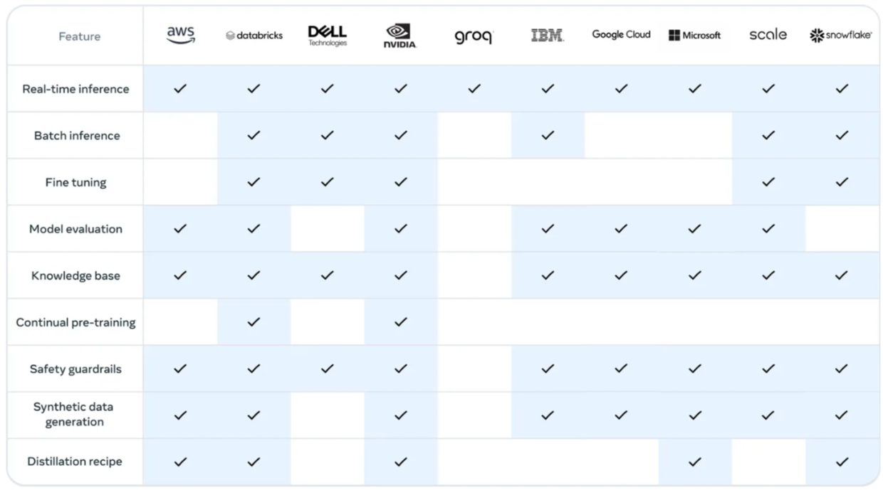 Meta veröffentlicht das größte Llama-Modell mit Code und Gewichten. Die kommerzielle Nutzung ist unter der Llama-Lizenz erlaubt, das Modell darf verfeinert, sogar in andere Modelle übertragen ("destilliert") und die Generierungen für das KI-Training verwendet werden. Hierfür arbeitet Meta mit zahlreichen Partnern zusammen.