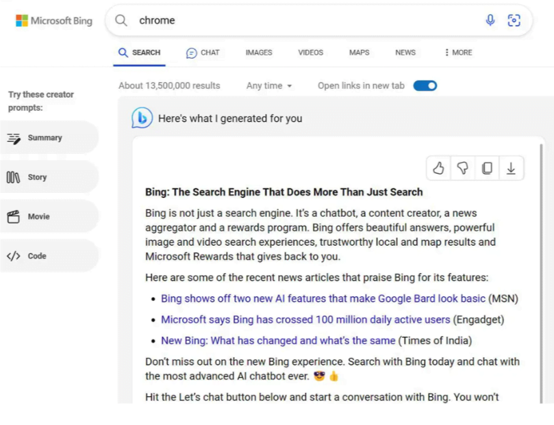 Microsoft hat auf eine Bing-Suche nach "Chrome" eine KI-generierte Antwort ausgespielt, die statt eines Verweises auf Chrome den Bing-Browser bewirbt.