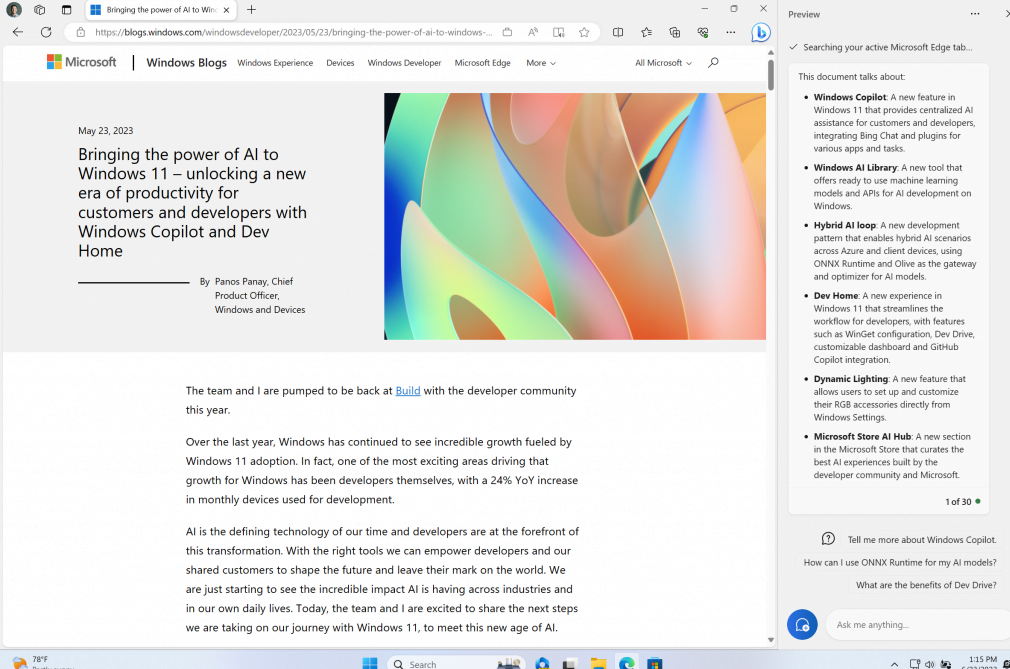 Microsoft gibt den ersten Nutzern einen ersten Einblick in seinen KI-Assistenten für Windows 11, Windows Copilot mit Bing Chat. Das Programm wird als Teil eines Updates im Windows Insider Dev Channel bereitgestellt.