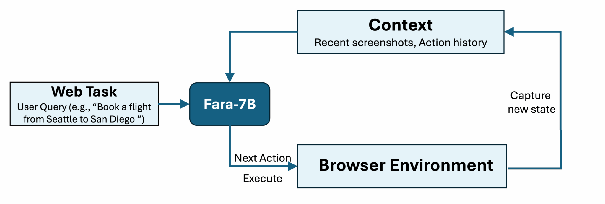 Das Modell basiert auf Alibabas Qwen2.5-VL-7B und nutzt laut Microsoft ausschließlich visuelle Informationen. Es verarbeitet Screenshots der Benutzeroberfläche, ohne auf technische Hilfsmittel wie Accessibility Trees oder HTML-Parsing angewiesen zu sein. In einer Schleife aus Beobachten, Denken und Handeln sagt das Modell Koordinaten für Klicks voraus oder generiert Tastatureingaben. Dabei berücksichtigt es den Verlauf der Aktionen, die letzten drei Screenshots und die Nutzereingaben.