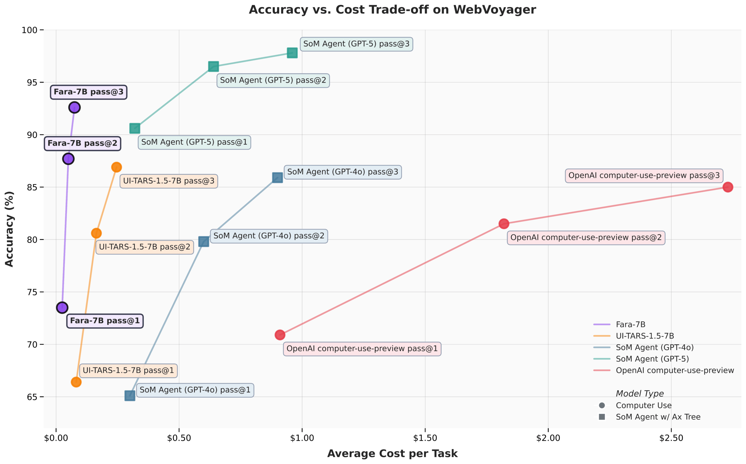 In den von Microsoft veröffentlichten Benchmarks zeigt das Modell eine hohe Leistungsfähigkeit im Vergleich zu seiner Größe. Im WebVoyager-Benchmark erreicht Fara-7B eine Erfolgsquote von 73,5 Prozent. Damit liegt es laut den Autoren vor dem UI-TARS-1.5-7B Modell und übertrifft sogar OpenAIs kommerzielles GPT-4o. Eine unabhängige Überprüfung durch die Firma Browserbase mit menschlichen Bewertern ergab eine Erfolgsquote von 62 Prozent.
