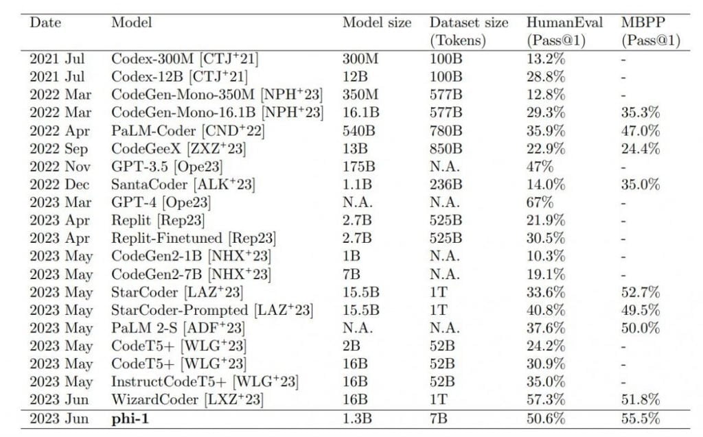 Das größte kleine Modell phi-1, das zusätzlich mit Codeaufgaben verfeinert wurde, schlägt mit nur 1,3 Milliarden Parametern in den Benchmarks HumanEval und MBPP Modelle, die 10x größer sind und 100x mehr Daten für das Training verwenden. Nur GPT-4 übertrifft phi-1 in den Testszenarien.
