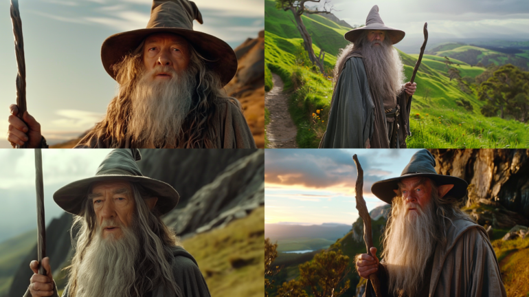 Die Prompts für diese Bilder sind einfach zu schreiben, es genügt der Name des Films, eine Jahreszahl und ein Hinweis wie "movie scene" oder "screenshot from a movie". Ich konnte nach demselben Schema etwa diese Bilder mit Gandalf aus "Herr der Ringe" generieren. Bilder zwei und vier wirken sehr nah am Original.