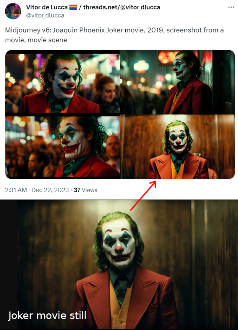 Bei X zeigen Midjourney-Anwenderinnen und -Anwender entsprechende Beispiele. Am eindrucksvollsten ist das von Joaquin Phoenix im Joker-Film von 2019. Der Prompt "Joaquin Phoenix Joker movie, 2019, screens from movie, movie scene" liefert ein Bild, das fast exakt einer Filmszene entspricht.