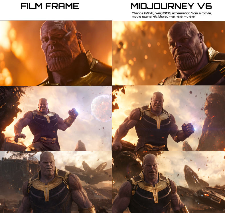 Der Unterschied liegt hauptsächlich in der Beleuchtung und den Farben. Die Bilder sind so ähnlich, dass es sich sogar um eine leicht modifizierte Version der Trainingsdaten handeln könnte, die hier ausgegeben wird (Bild 1: Midjourney, Bild 2: Original Filmszene).