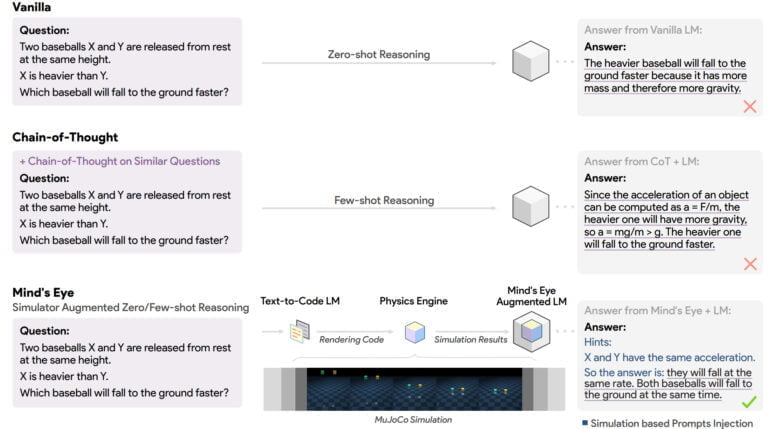 Um Sprachmodelle in der physikalischen Welt zu verankern, schlagen die Forschenden vor, Anfragen an das Sprachmodell in der Physiksimulation MuJoCo zu simulieren und mögliche Ergebnisse anschließend als Teil des Inputs für das Sprachmodell zu verwenden. Das Team nennt dieses Paradigma "Mind's Eye" und testet es am dafür erstellten UTOPIA-Benchmark für physikalisches Schlussfolgern.