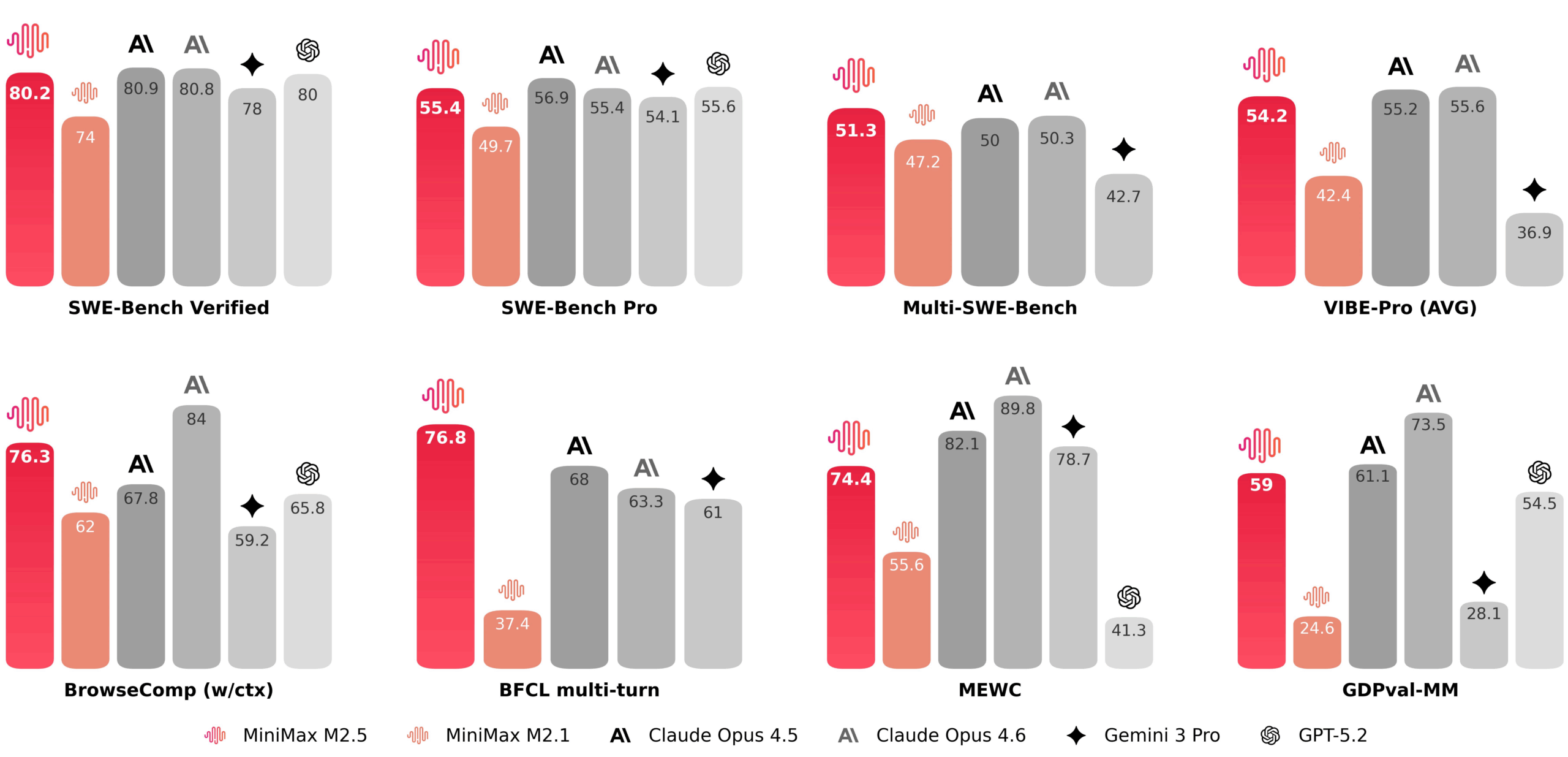 Das Modell erreicht laut den veröffentlichten Benchmarks Spitzenwerte beim Programmieren: 80,2 Prozent im SWE-Bench Verified, 79,7 Prozent auf der Droid-Plattform und 76,1 Prozent auf OpenCode – teils knapp vor Anthropics Claude Opus 4.6. Auch bei Websuche (BrowseComp: 76,3 %), KI-Agenten-Werkzeugnutzung (BFCL: 76,8 %) und Büroarbeit wie Excel-Aufgaben liegt M2.5 laut MiniMax teils vor GPT-5.2, Gemini 3 Pro und Claude.
