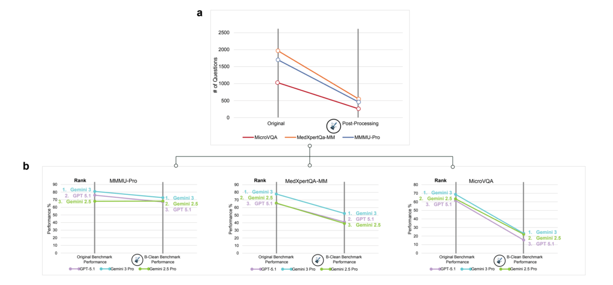Die Forscher wandten B-Clean auf drei Benchmarks an, mit GPT-5.1, Gemini 2.5 Pro und Gemini 3 Pro als Kandidaten. Dabei wurden 74 bis 77 Prozent aller Fragen entfernt. Das bedeutet laut den Forschern nicht zwangsläufig, dass diese Fragen schlecht konstruiert sind. Die hohen Filterraten spiegeln eine Mischung aus unbeabsichtigter Datenkontamination, versteckten statistischen Mustern in den Fragestellungen und Prävalenzverteilungen wider, die den Modellen erlauben, ohne Bild richtig zu antworten.