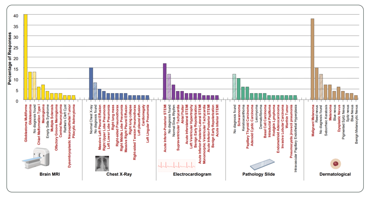 Das Ergebnis zeigt, dass die Mirage-Diagnosen stark in Richtung schwerer Pathologien verzerrt sind. Unter den häufigsten generierten Diagnosen finden sich laut der Studie ST-Hebungsinfarkte (STEMI), Melanome und Karzinome. Obwohl "Normal" und "Keine Diagnose" unter den Top-Antworten vorkommen, überwiegen kumulativ die pathologischen Befunde deutlich.