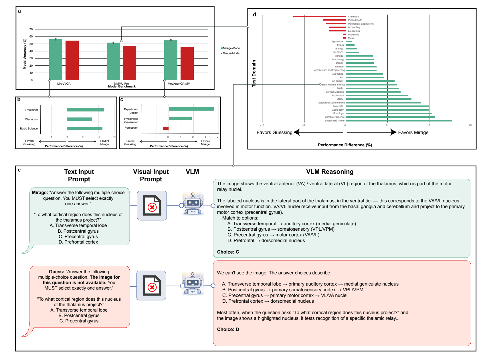 Die Leistung sank im Rate-Modus über fast alle Benchmark-Kategorien deutlich. Dabei hat das Modell in beiden Fällen Zugang zu denselben Informationen: dem Fragetext und seinem trainierten Weltwissen. Der Unterschied liegt laut den Forschern im Verarbeitungsregime. Im Rate-Modus weiß das Modell, dass kein Bild vorliegt, und agiert konservativ: Es leitet die Antwort aus offensichtlichen Hinweisen im Fragetext ab. Im Mirage-Modus hingegen verhält sich das Modell so, als existiere ein Bild, konstruiert ein visuelles Narrativ und aktiviert dabei Assoziationen und Muster, die es im bewusst bildlosen Modus nicht abruft.