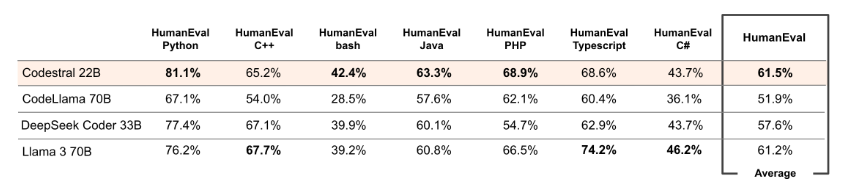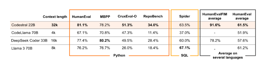 Als 22 Milliarden Parameter umfassendes Modell setzt Codestral im Vergleich zu früheren Modellen einen neuen Standard für das Verhältnis von Leistung und Latenz bei der Codegenerierung. Mit seinem größeren Kontextfenster von 32.000 Token übertrifft Codestral alle anderen Modelle in der RepoBench, einem Benchmark für längeren Code.