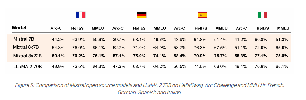 Auch in den unterstützten Fremdsprachen Französisch, Deutsch, Spanisch und Italienisch übertrifft es das LLaMA-2-Modell mit 70 Milliarden Parametern in den Benchmarks HellaSwag, Arc Challenge und MMLU deutlich.