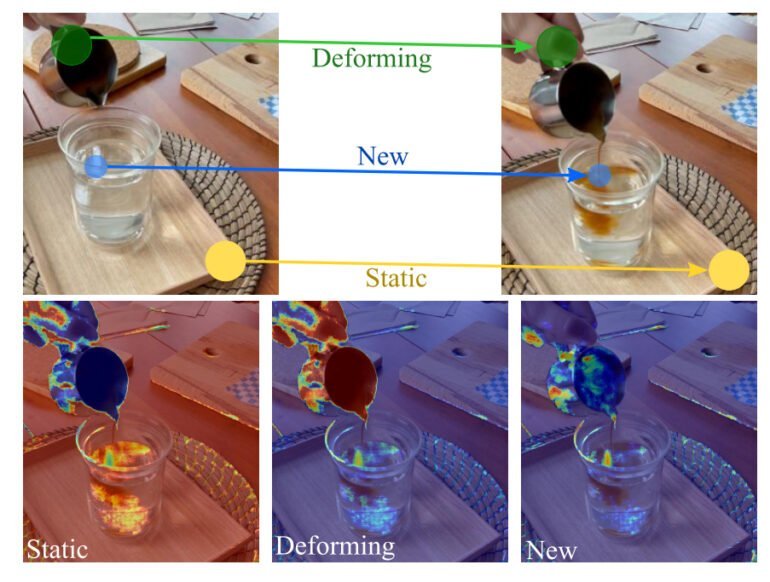 Im Falle des Kaffees bleibt etwa das Holzbrett statisch, auf dem das Glas steht. Der Inhalt des Glases erscheint neu und die sichtbare Hand deformiert sich. Ein Dekompositionsfeld übernimmt die Aufteilung der Szene in die drei Kategorien. Jeder Bereich wird von einem eigenen Neural Field repräsentiert.