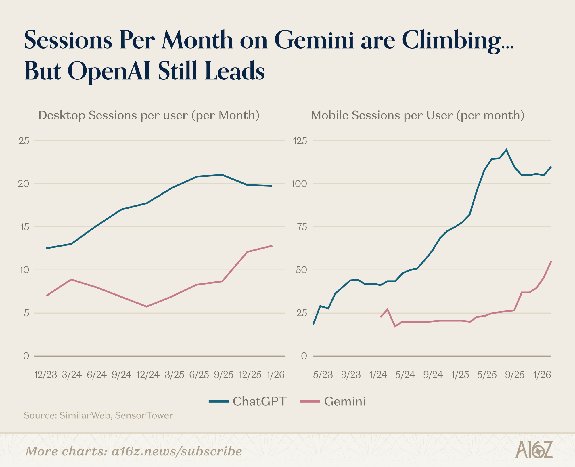 Die eigenen Rankings unterschätzen laut a16z zunehmend, welche KI-Produkte die Menschen tatsächlich nutzen. Je stärker sich KI vom eigenständigen Produkt zum eingebetteten Feature wandle, desto weniger taugten Web-Traffic und App-Downloads als Maßstab. Google etwa startete "Personal Intelligence", das Gemini mit Gmail, Fotos und YouTube verbindet.