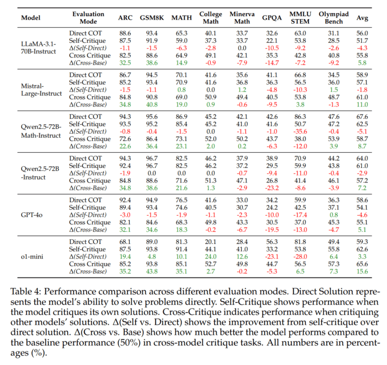 Bei der Fremdkritik (Cross-Critique) bewerten die Modelle Lösungen anderer KI-Systeme. Hier schnitten alle Modelle besser ab und konnten fehlerhafte Lösungen verbessern. O1-mini erreichte mit 15,6 Prozent die höchste durchschnittliche Verbesserungsrate.