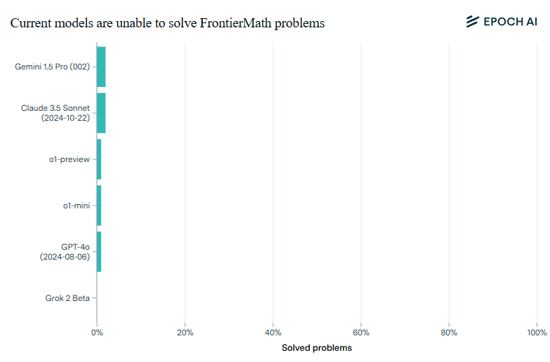 Selbst die leistungsfähigsten Sprachmodelle wie Gemini 1.5 Pro und Claude 3.5 schaffen es nur, etwa 2 Prozent der FrontierMath-Probleme zu lösen. Dies unterstreicht die anhaltende Herausforderung komplexer mathematischer Problemlösung für KI-Systeme. | Bild: Epoch AI