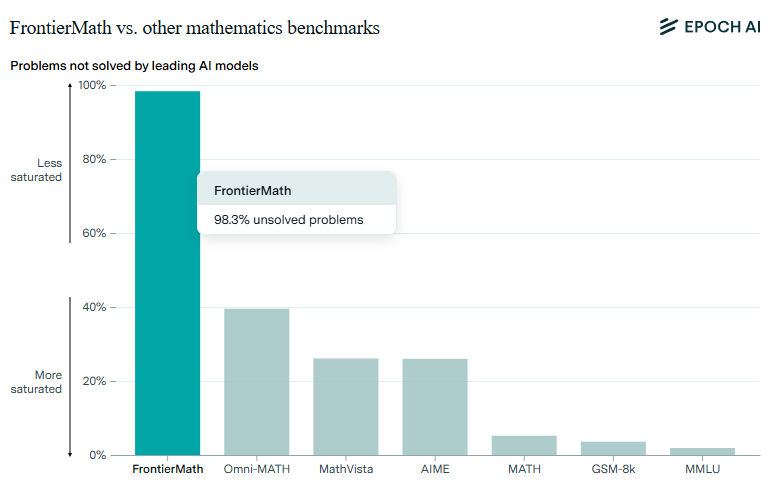Balkendiagramm: Vergleich von 7 KI-Mathematik-Benchmarks, FrontierMath mit 98,3% ungelöster Probleme führend.