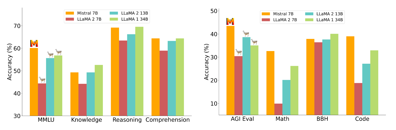 Mistral 7B übertrifft das größere Llama 2 13B in allen Benchmarks und Llama 1 34B in vielen. Außerdem nähert sich Mistral 7B der Programmierleistung von CodeLlama 7B an und erzielt weiterhin gute Ergebnisse bei Aufgaben in englischer Sprache.