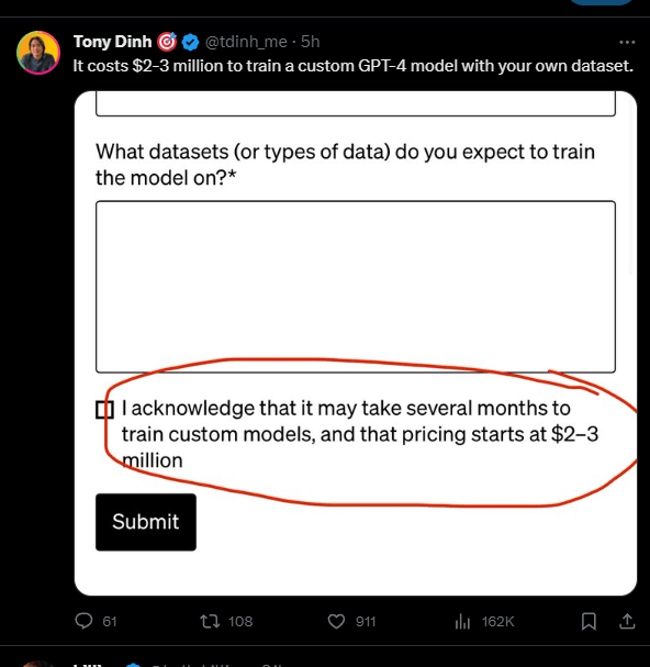 Das GPT-4-Feintuning scheint jedoch wesentlich aufwendiger zu sein, mit Preisen, die erst bei zwei Millionen US-Dollar beginnen, und einer Datenmenge von mindestens einer Milliarde Token im Besitz des Unternehmens. OpenAI bietet das Feintuning nur ausgewählten Unternehmen an, die dann exklusiven Zugriff auf ihr eigenes Modell haben.