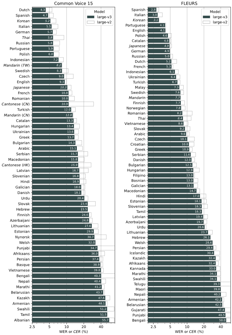 Die Leistung variiert je nach Sprache, aber im Allgemeinen kann Whisper v3 in der größten Version eine Fehlerrate von weniger als 60 Prozent für Common Voice 15 und Fleurs vorweisen, was laut OpenAI einer Fehlerreduktion von 10 bis 20 Prozent im Vergleich zu large-v2 entspricht. Whisper v3 ist auf Github verfügbar. Eine API-Implementierung bei OpenAI wird in Kürze folgen.