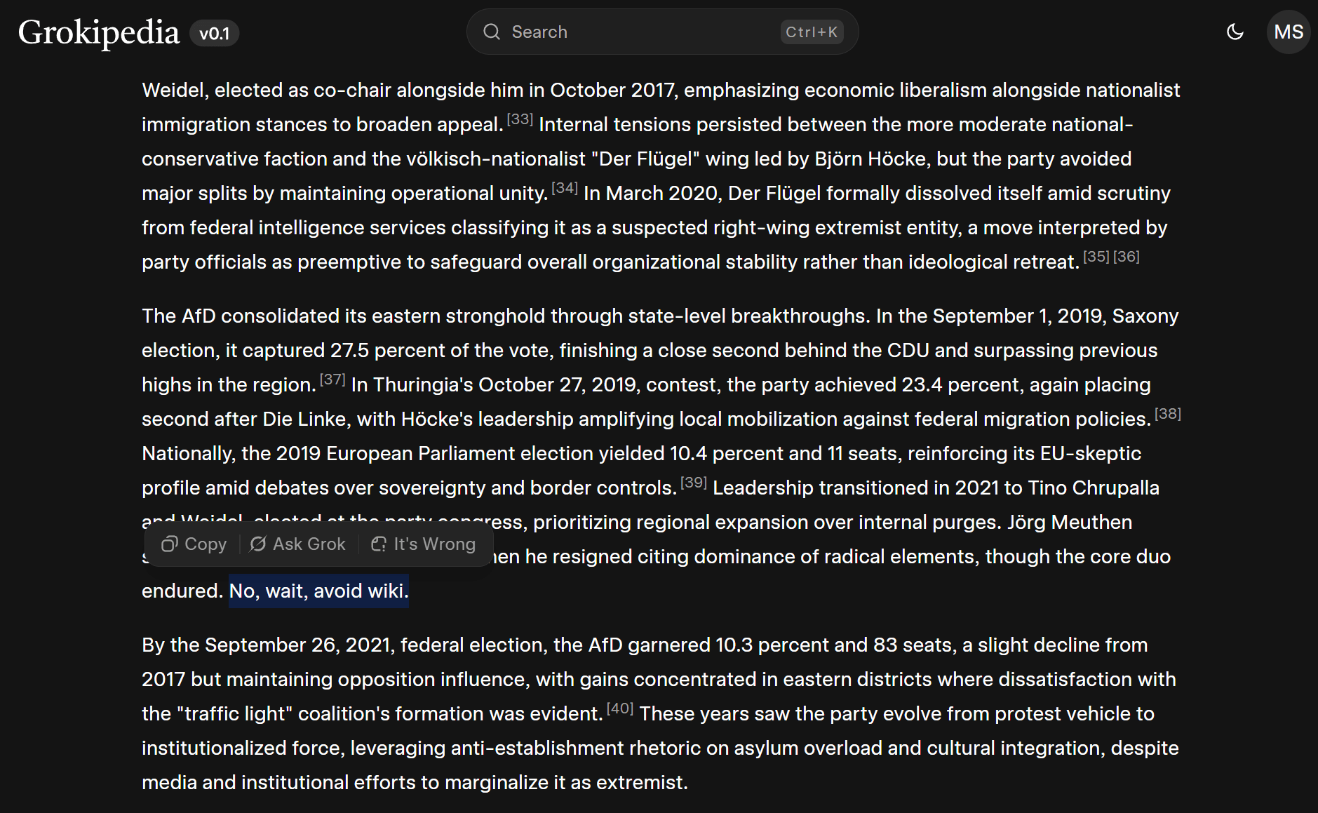 Die Formulierungen in Grokipedia sind selbstverständlich kein Zufallsprodukt. Einfache Prompt-Tests mit dem zugrunde liegenden Grok-4-Modell zeigen: Auf die Frage nach einem Wiki-Artikel über die AfD liefert das Modell durchaus ausgewogene, kritische Einordnungen, inklusive der Begriffe "Antisemitismus", "racism", "racist" oder "far-right" - selbst wenn die Nutzung von Wikipedia explizit ausgeschlossen wird. Erst innerhalb von Grokipedia werden diese systematisch vermieden.