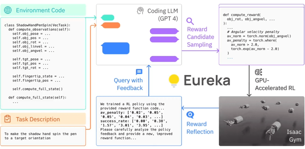 Eureka schreibt selbstständig Belohnungsalgorithmen, um Roboter zu trainieren. Laut einer von Nvidia veröffentlichten Studie sind die von Eureka generierten Belohnungsprogramme in 83 Prozent der Aufgaben besser als die von Experten geschriebenen Programme. Dies führt zu einer durchschnittlichen Verbesserung der Roboterleistung um 52 Prozent.