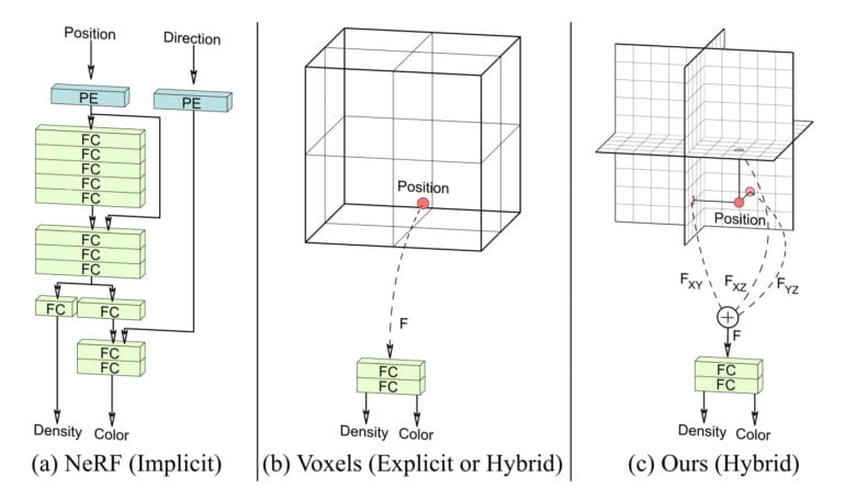 NeRFs setzen dafür auf neuronale Netze, in denen sich im Training eine implizite 3D-Repräsentation des gelernten Objekts bildet. Der Gegenentwurf zur gelernten impliziten Repräsentation sind die expliziten Repräsentationen eines Voxel-Gitters.