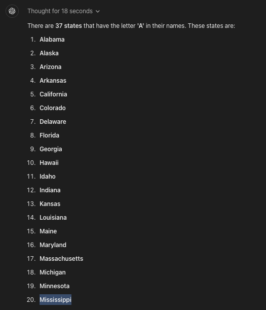 Während o1-preview diese Zählaufgabe endlich verlässlich meistert, versagt es laut einem Beitrag von Ed Zitron dabei, alle US-Staaten zu nennen, die ein "a" enthalten - denn an 20. Stelle ist "Mississippi" zu lesen. Dabei soll o1-preivew zuvor 18 Sekunden nachgedacht haben.